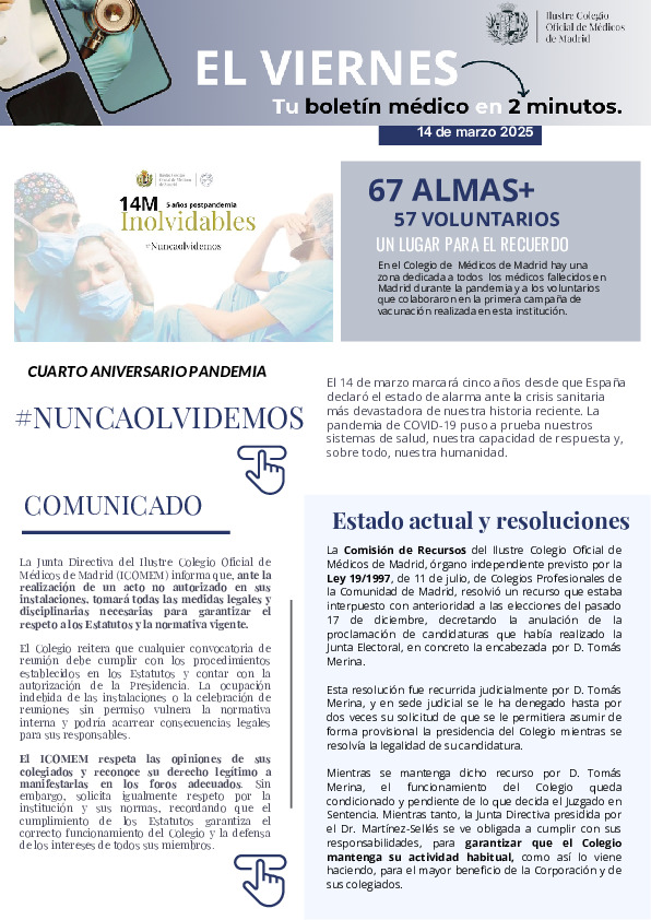 Desde el mes de febrero de 2024, enviamos el boletín El Viernes al correo electrónico de los Colegiados para que puedan leer de manera fácil y rápida todas las novedades médicas y colegiales. Por tanto, no se colgarán en PDF en esta sección de la web, aunque seguirán publicados los anteriores boletines a modo de hemeroteca.