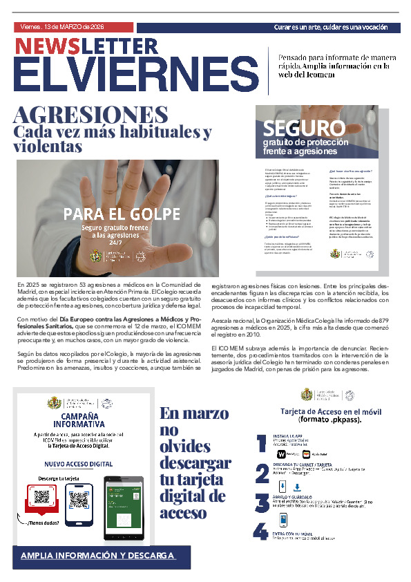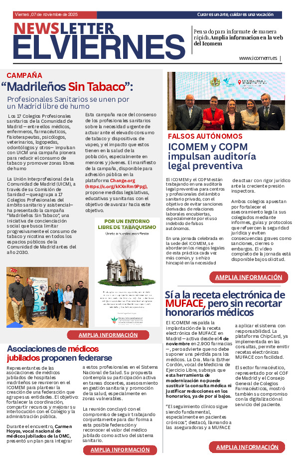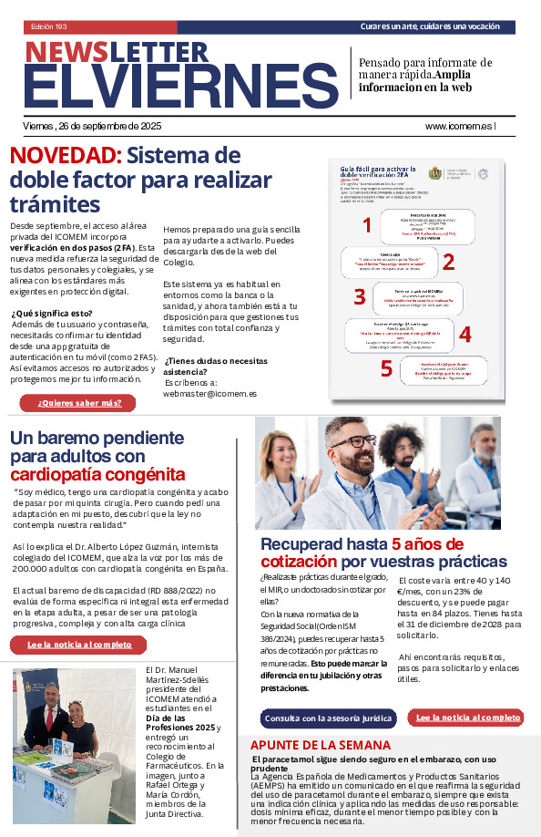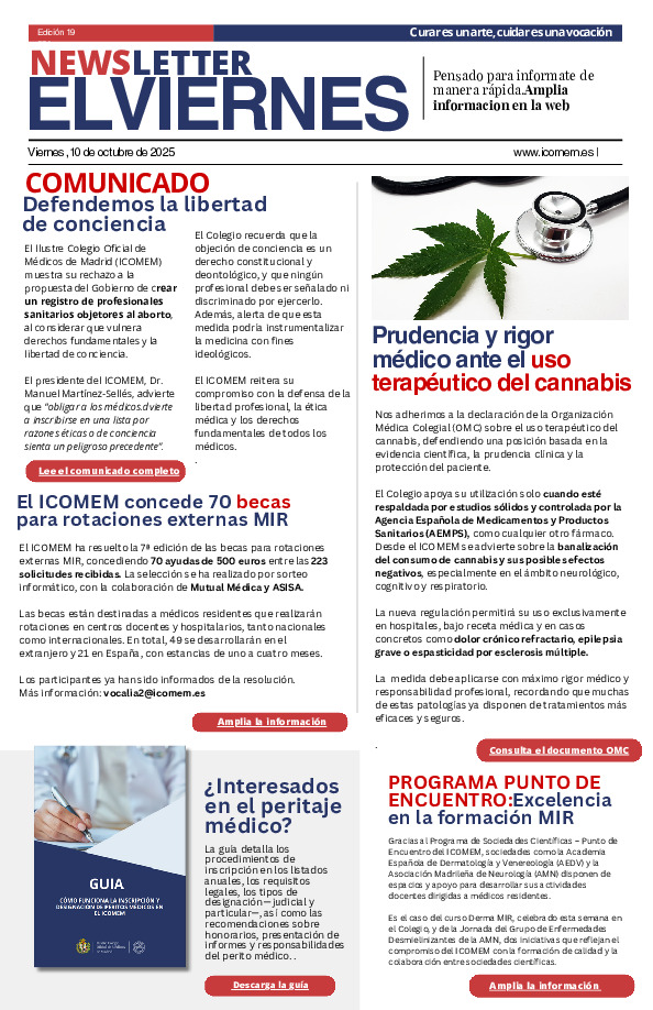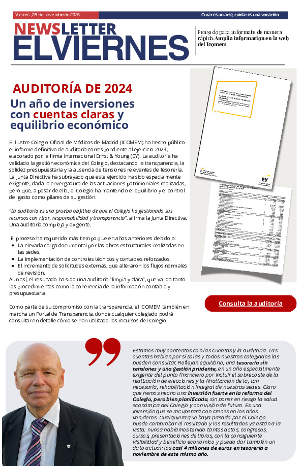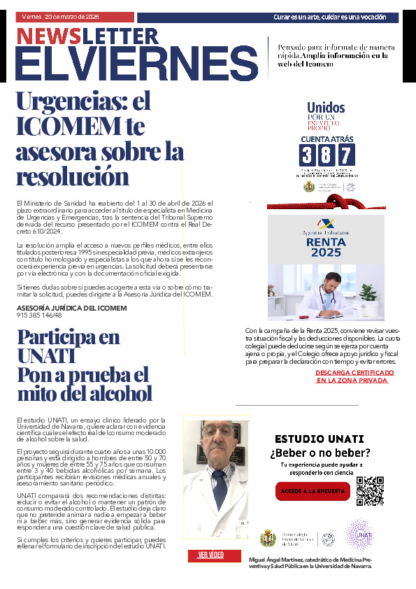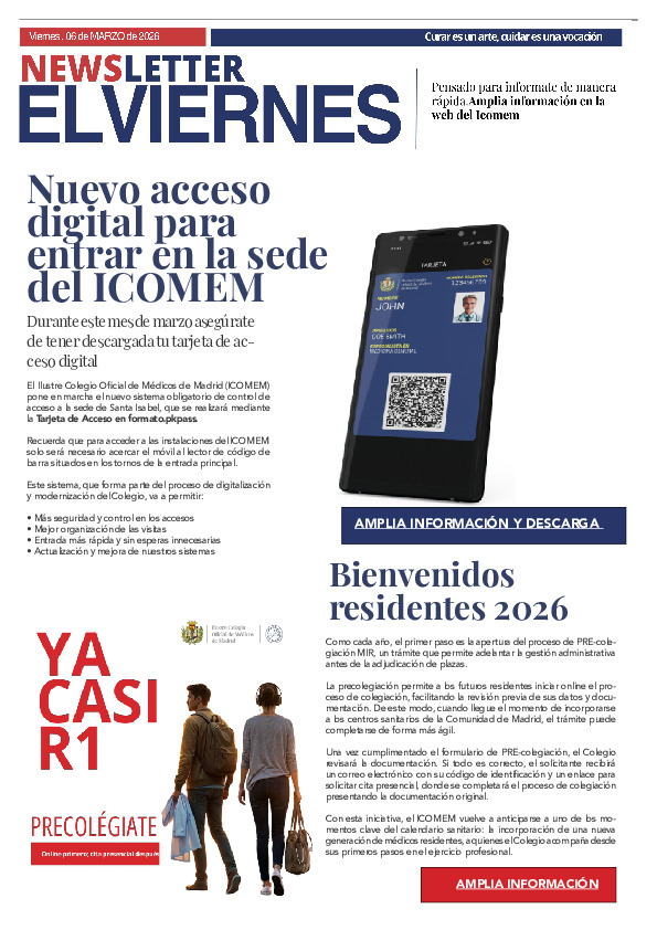 Desde el mes de febrero de 2024, enviamos el boletín El Viernes al correo electrónico de los Colegiados para que puedan leer de manera fácil y rápida todas las novedades médicas y colegiales. Por tanto, no se colgarán en PDF en esta sección de la web, aunque seguirán publicados los anteriores boletines a modo de hemeroteca.
