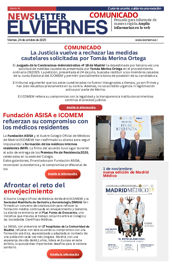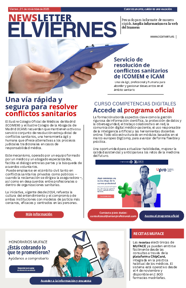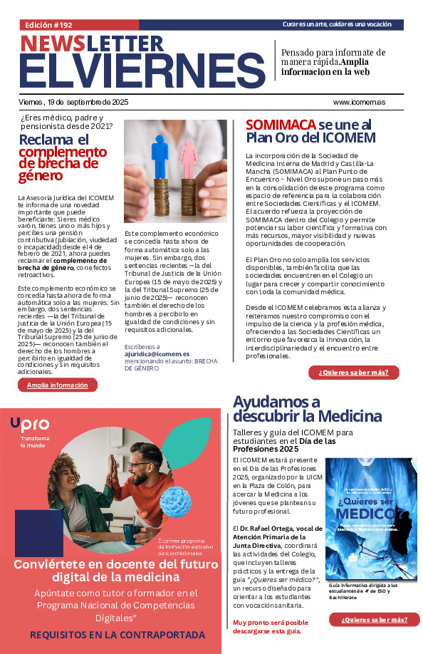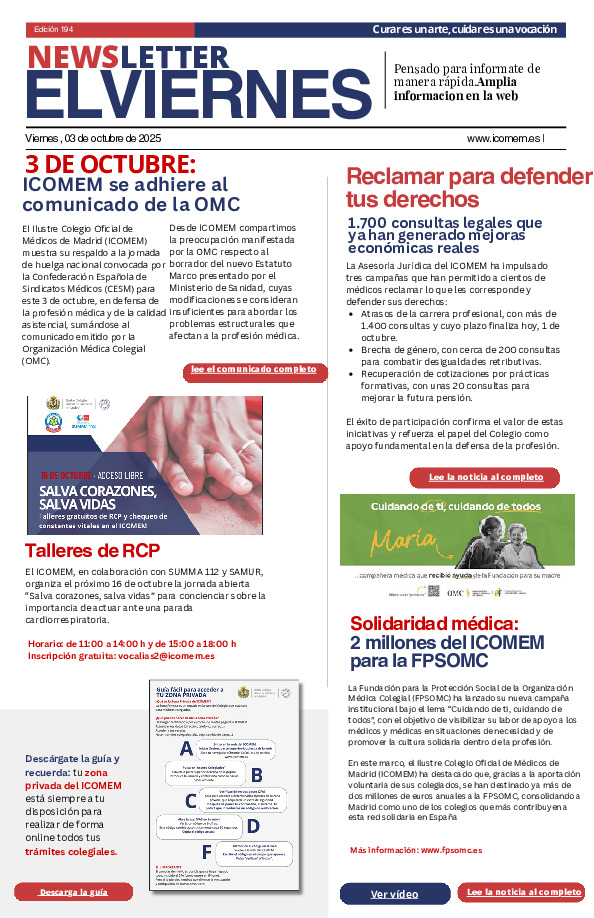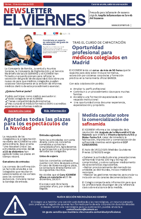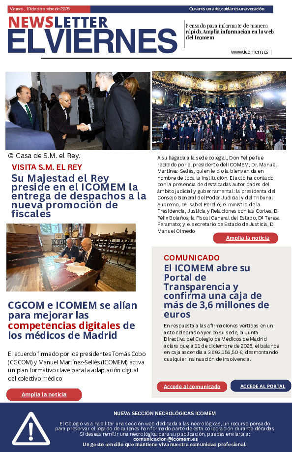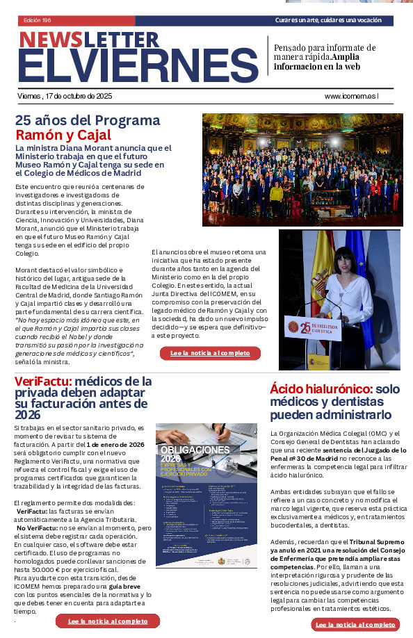 Desde el mes de febrero de 2024, enviamos el boletín El Viernes al correo electrónico de los Colegiados para que puedan leer de manera fácil y rápida todas las novedades médicas y colegiales. Por tanto, no se colgarán en PDF en esta sección de la web, aunque seguirán publicados los anteriores boletines a modo de hemeroteca.