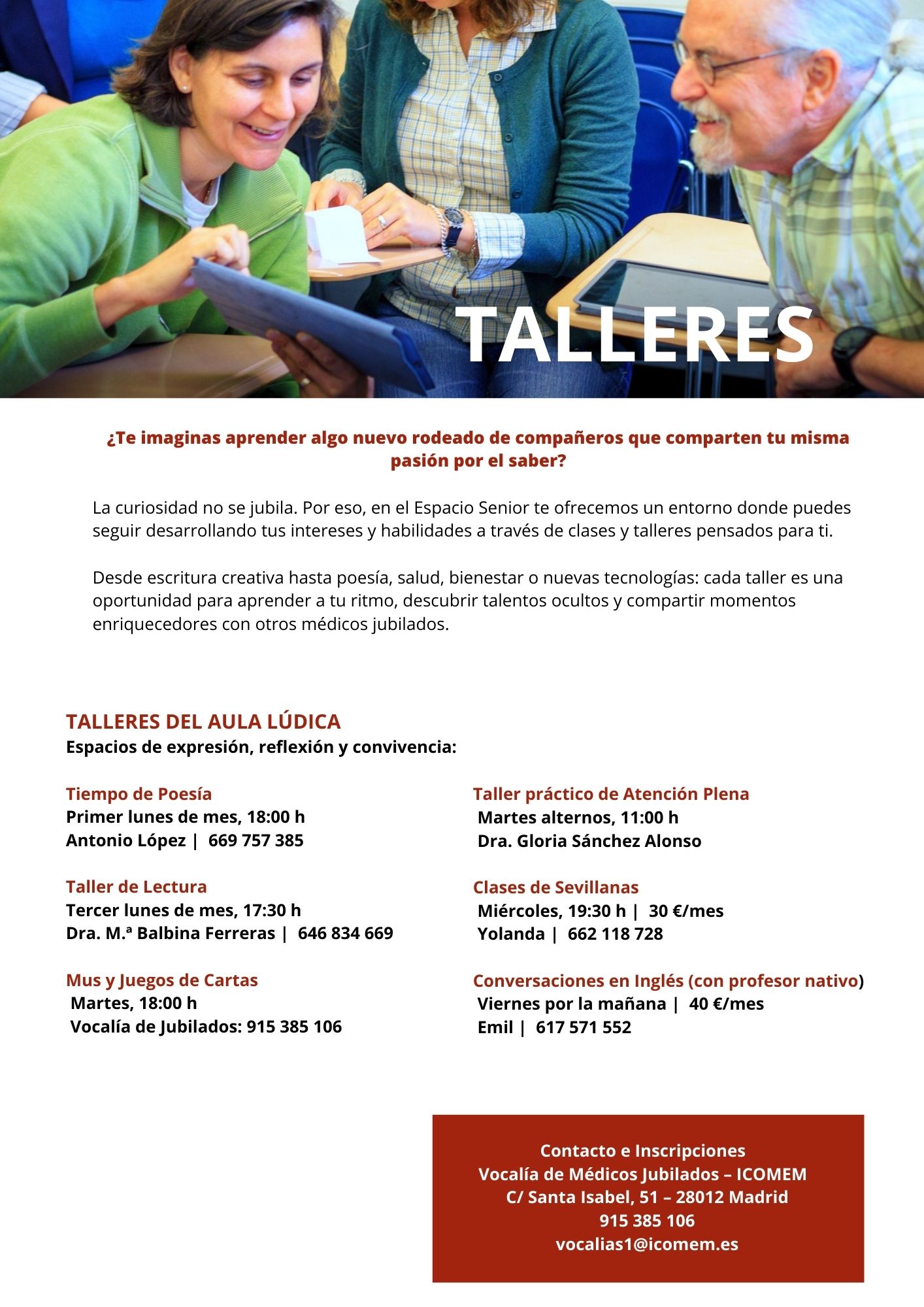 La Vocalía de Médicos Jubilados del ICOMEM es un espacio de representación, encuentro y apoyo destinado a los colegiados que han finalizado su ejercicio profesional activo. Su principal objetivo es mantener el vínculo entre los médicos jubilados y el Colegio, fomentando su participación en la vida colegial a través de actividades culturales, formativas, recreativas y sociales. Esta vocalía promueve el envejecimiento activo, el bienestar emocional y la integración en la comunidad médica, reconociendo el valor de la experiencia acumulada y ofreciendo un entorno donde continuar aportando, compartiendo y disfrutando en esta nueva etapa vital.